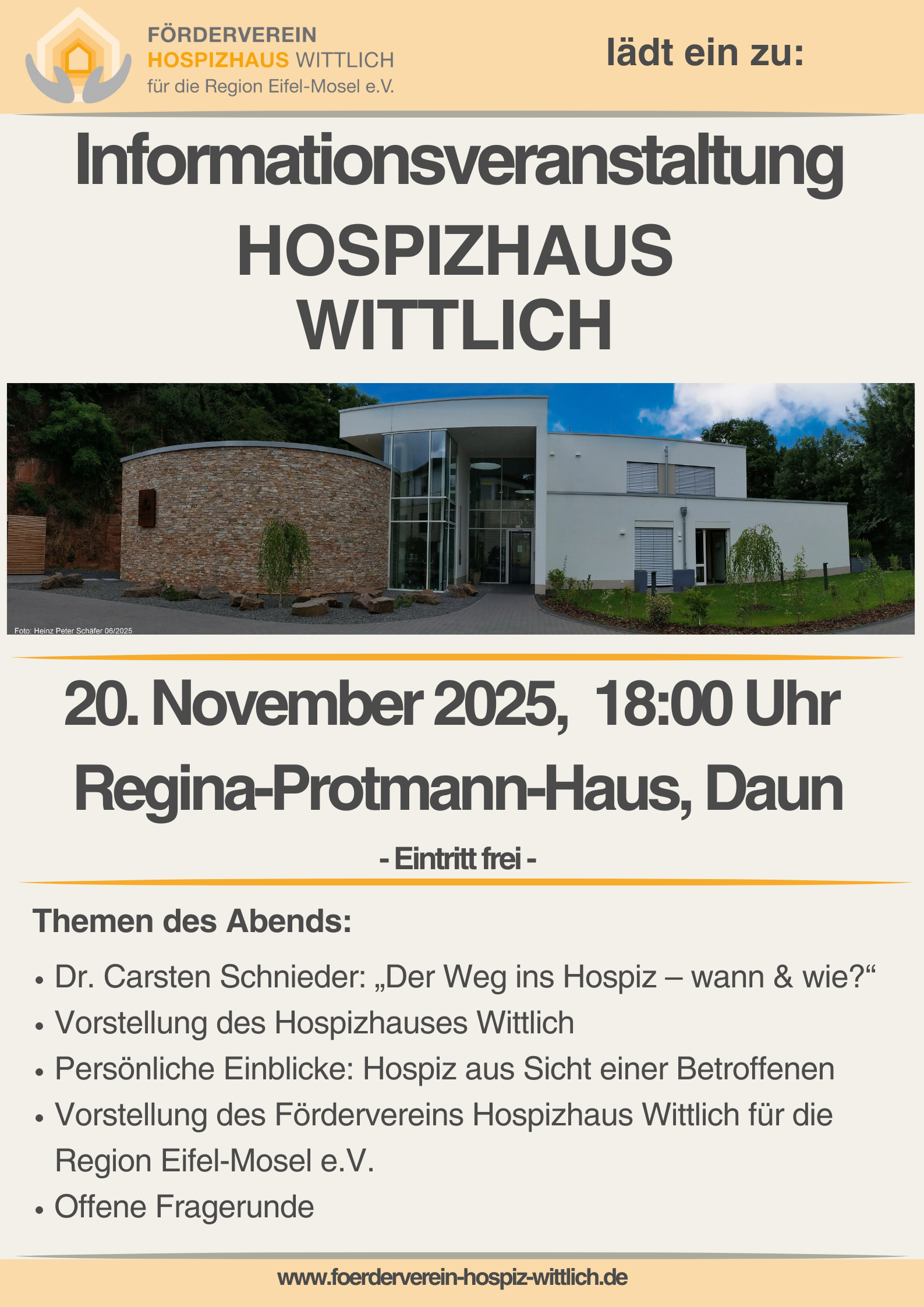 Der Förderverein Hospizhaus Wittlich lädt herzlich ein zu einer Informationsveranstaltung im Regina-Protmann-Haus in Daun.